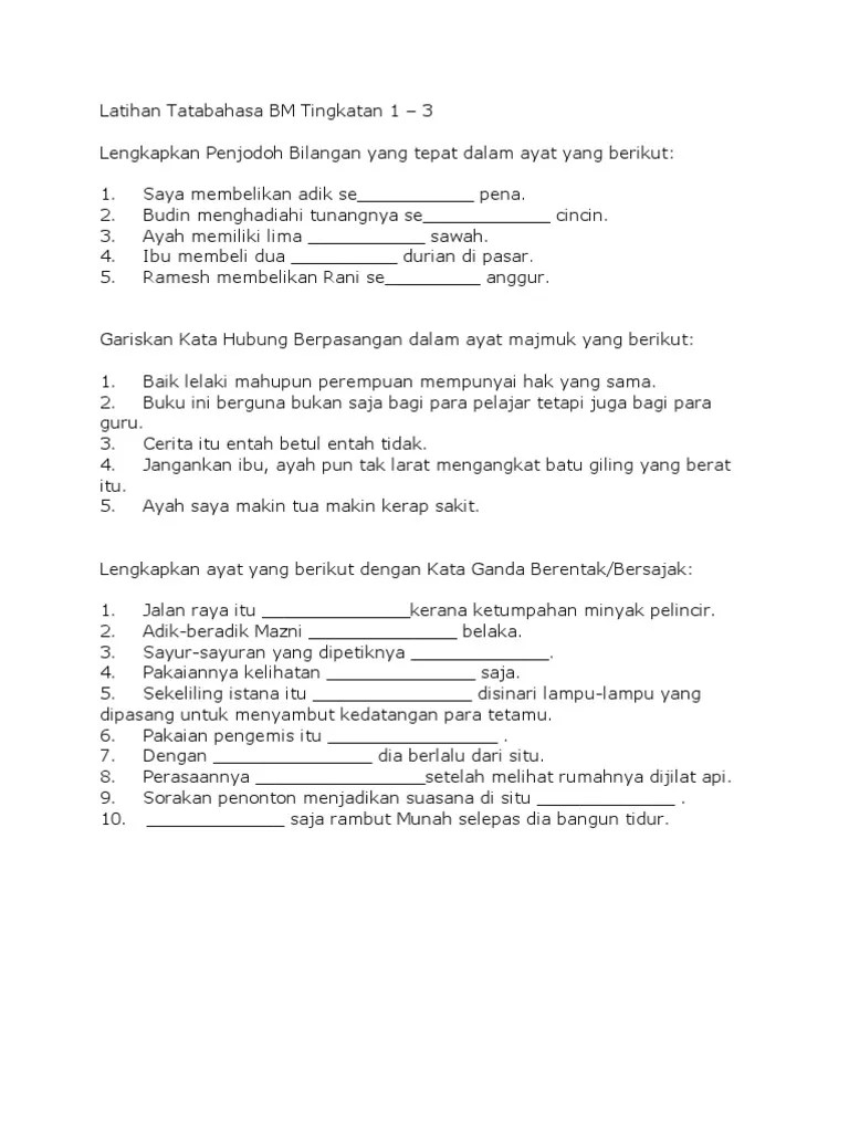 Latihan bahasa melayu tingkatan 1 pdf. Sila muat turun melalui pautan yang telah disenaraikan di bawah. Latihan tatabahasa tingkatan 1 kssm. Koleksi soalan peperiksaan, percubaan, ujian, kbat, nota, . Buku teks pdf kssm tingkatan 1 bahasa melayu. Download (nota & latihan tatabahasa) :. Nota dan latihan januari (edisi guru) bahasa melayu tingkatan 1 nama: .